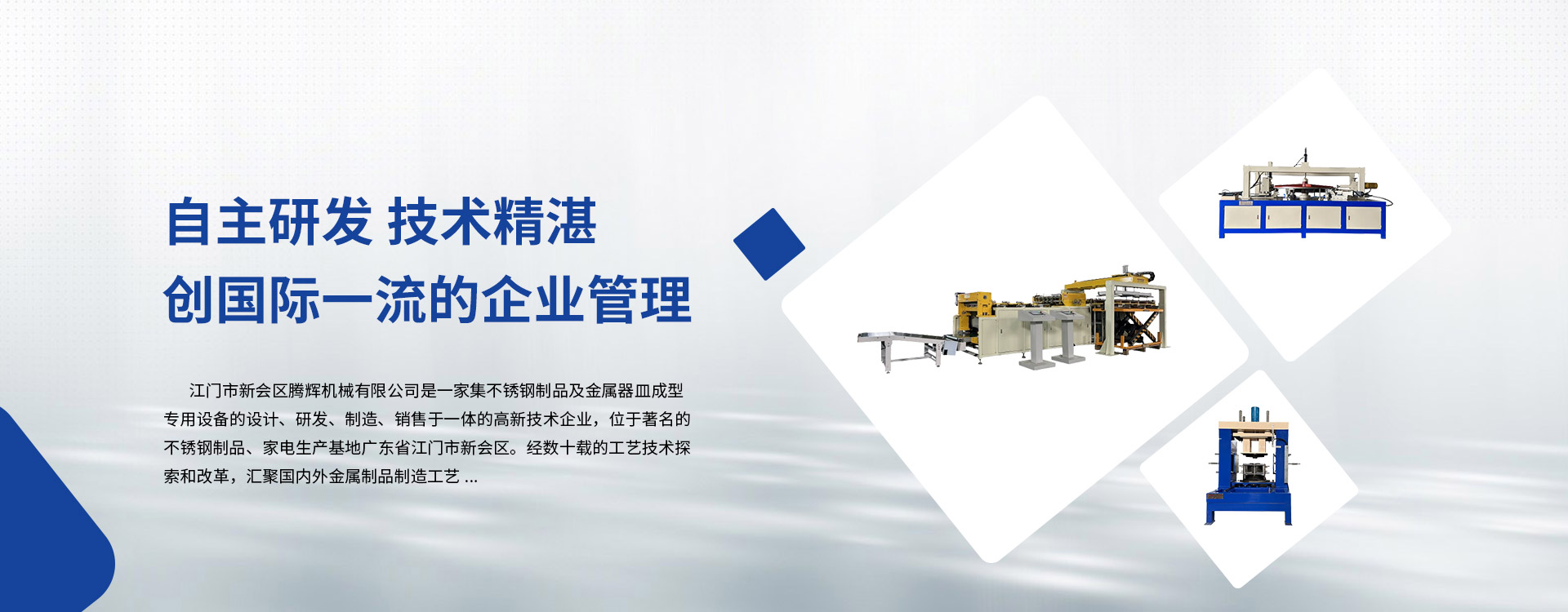 江門(mén)市新會(huì)區(qū)騰輝機(jī)械有限公司是一家集不銹鋼制品及金屬器皿成型專(zhuān)用設(shè)備的設(shè)計(jì)、研發(fā)、制造、銷(xiāo)售于一體的高新技術(shù)企業(yè),位于著名的不銹鋼制品、家電生產(chǎn)基地廣東省江門(mén)市新會(huì)區(qū)。經(jīng)數(shù)十載的工藝技術(shù)探索和改革,匯聚國(guó)內(nèi)外金屬制品制造工藝。