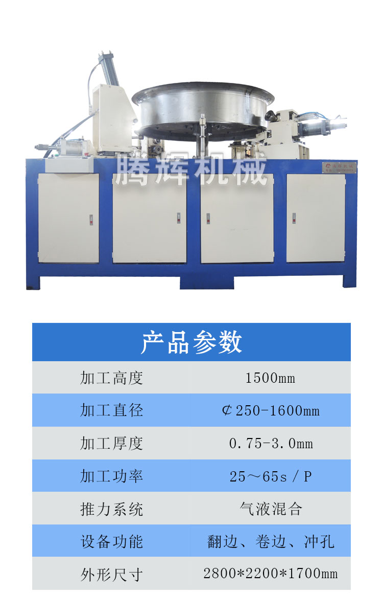 本文介紹的設備專用于軸流風機外殼的翻邊沖孔機,加工直徑范圍可達1600mm,該機器操作簡單,更換模具快捷,能耗低、效率高,一人操作即可完成風機翻邊、卷邊、打孔的制作。(公司根據(jù)客戶需求,為客戶量身定制適合的設備,歡迎新老客戶咨詢了解)