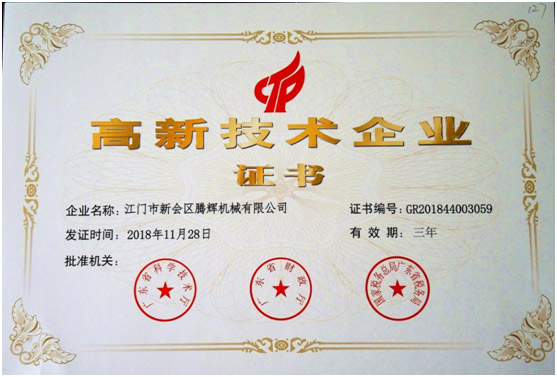 一直以來(lái)江門市新會(huì)區(qū)騰輝機(jī)械有限公司堅(jiān)持勇于創(chuàng)新,突破常規(guī),永不止步,敢于研發(fā)的精神,在全體員工的努力下本公司獲得“高新技術(shù)企業(yè)”。感謝政府對(duì)我們企業(yè)的技術(shù)認(rèn)可與支持,將來(lái)我們公司繼續(xù)堅(jiān)持技術(shù)創(chuàng)新為廣大的金屬成型生產(chǎn)企業(yè)降低生產(chǎn)難度,增加生產(chǎn)效率。